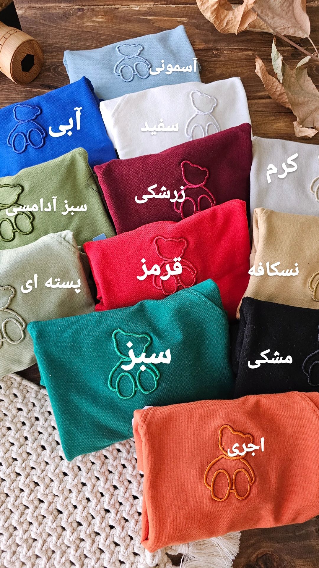 مشکی ,قرمز ,سفید ,سبز ,آبی ,زرد ,نسکافه ,کرم ,سبز یشمی ,نارنجی ,طوسی ,بنفش ,یاسی ,قهوه ای ,گلبه ای ,خردلی ,زرشکی ,شکلاتی ,صورتی ,سرخابی ,سرمه ای ,سبز آدامسی ,کالباسی ,کالباسی تیره ,آسمونی ,آجری ,زیتونی ,خاکی ,سدری ,شتری ,پاندا ,خرس ,میکی موس ,استیکر ,هاوایی ,فضایی ,ماشین ,حروف ,روباه ,پلنگی ,تدی ,شیری ,بنفش تیره ,پسته ای ,توت فرنگی ,رنگین کمان ,ابر ,گل بابونه ,طوسی تیره |