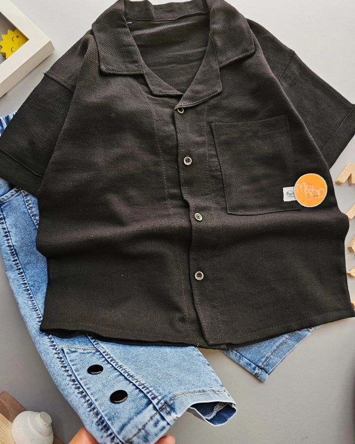🟡بلوزدکمه دار یقه انگلیسی جنس کنفی کاملا مشکی مشکیه بسیار خنک کیفیتش حرف نداره شلوارک جین کمر کش جیب دار راحت و باکیفیت ✅️